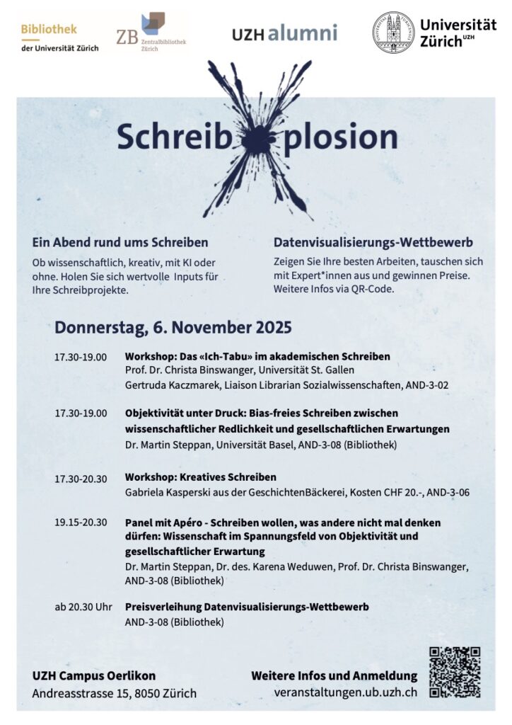 Am 6. November 2025 verwandelt sich der Campus Oerlikon in einen Ort für mutiges Schreiben: Bei der SchreibXplosion geht’s um Texte, die anecken dürfen – zu Themen wie Gender, Migration oder Nahost. In Workshops und einem Panel zu Objektivität und Bias und einem Datenvisualisierungswettbewerb lernst du, wie du kritisch, präzise und wirkungsvoll schreibst – auch zu heiklen Themen. Trau dich, Neues zu schreiben und melde Dich an.