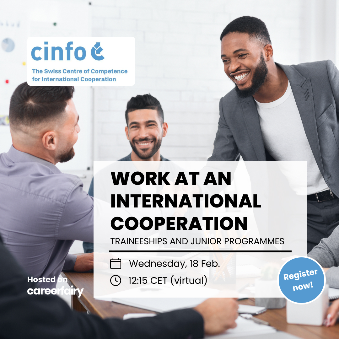 Curious how to break into international cooperation after graduation? Join the livestream with cinfo – Switzerland’s hub for global development careers – and get a clear overview of the field. Discover key employers, learn about entry points like junior and traineeship programmes, and get practical tips to boost your chances of landing a role. Whether you’re aiming for NGOs or international organisations, this is your starting point.