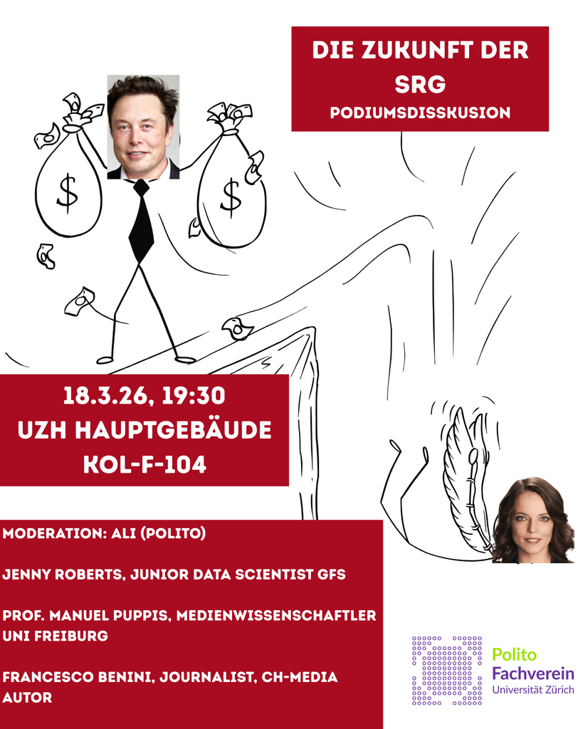 Kommt am 18.3.26 um 19:30 Uhr ins KOL-F-104 (UZH Hauptgebäude) und diskutiert mit uns über die Zukunft unserer Medienlandschaft.